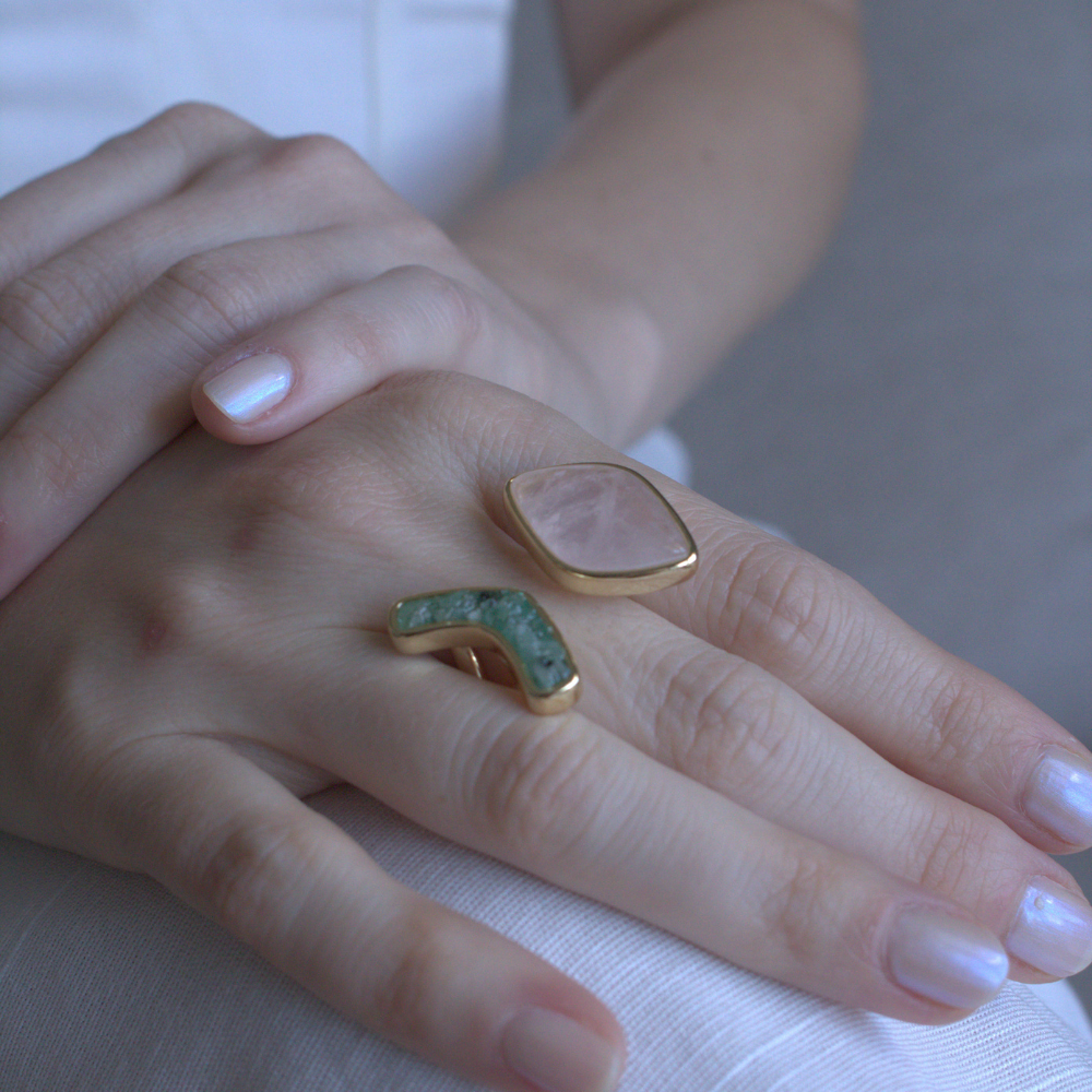 Seu formato aberto, moderno e orgânico, cria um encontro único entre o quadrado sutil do Quartzo Rosa e a faixa curvada de Esmeralda natural — duas energias que se encontram, se equilibram e se ampliam.