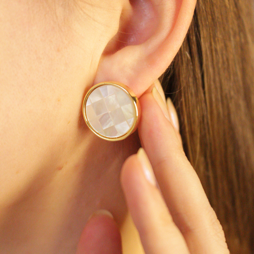- Conteúdo: 1 brinco com mosaico de Madrepérola em formato redondo