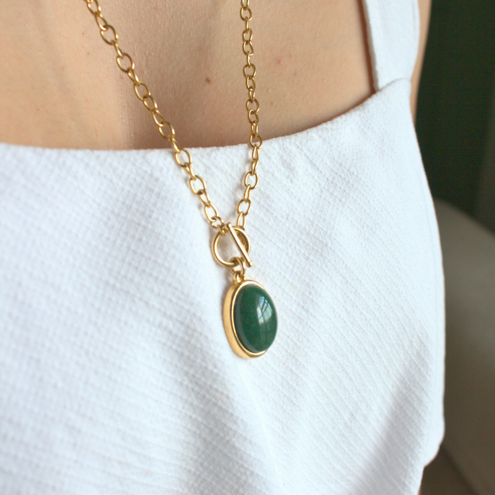 O colar com pedra natural em destaque traz uma proposta moderna com toque clássico. O pingente oval ganha presença na medida certa, enquanto a corrente de elos com fecho frontal adiciona personalidade e um acabamento contemporâneo à peça.