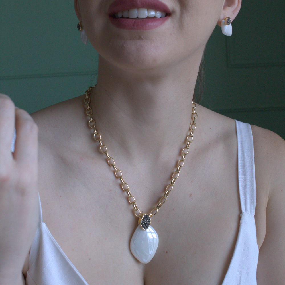 O Conjunto Aura Vivaz Porcelana e Pirita nasce da união entre formas delicadas e um brilho sutilmente poderoso. O pingente e os brincos trazem uma base lisa e suave, em tom porcelana, que cria um contraste elegante com a textura da Pirita — o detalhe energético que transforma toda a peça.