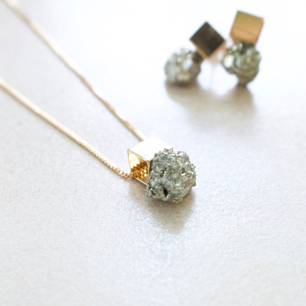 Conjunto Colar e Brincos Cubo com Pedra Natural Pirita