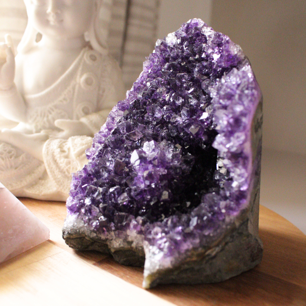 A Ametista é uma pedra extremamente poderosa e protetora, com uma vibração altamente espiritual. A sua serenidade favorece a meditação e estados de consciência mais elevados, ajudando a conexão com a nossa verdade interna. Inspira a cura e trabalha no desenvolvimento das habilidades intuitivas. É a pedra da transmutação de pensamentos e energia.