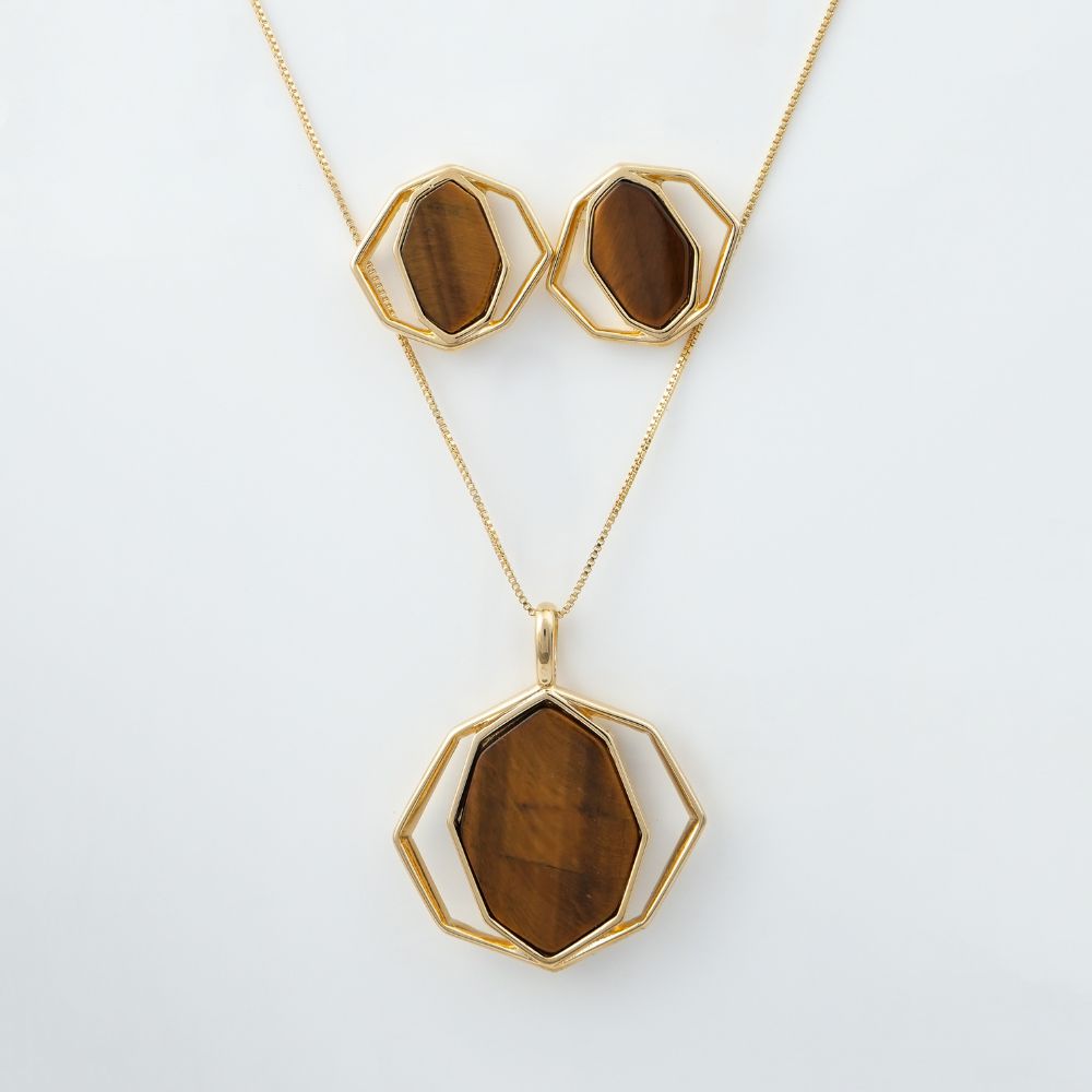 O conjunto de colar e brincos com pedra natural Olho de Tigre da Jaya Pedras Naturais é uma combinação perfeita de elegância e poder. Confeccionado com corrente e brincos banhados a Ouro 18K, este conjunto oferece um brilho duradouro e sofisticado. A corrente possui 65cm de comprimento mais 7cm de extensor, garantindo um ajuste confortável e versátil. O pingente de Olho de Tigre no colar e os brincos em formato geométrico destacam a beleza natural da pedra, tornando cada peça única. Este conjunto não só complementa seu visual, mas também proporciona benefícios energéticos, promovendo autoconfiança e proteção.