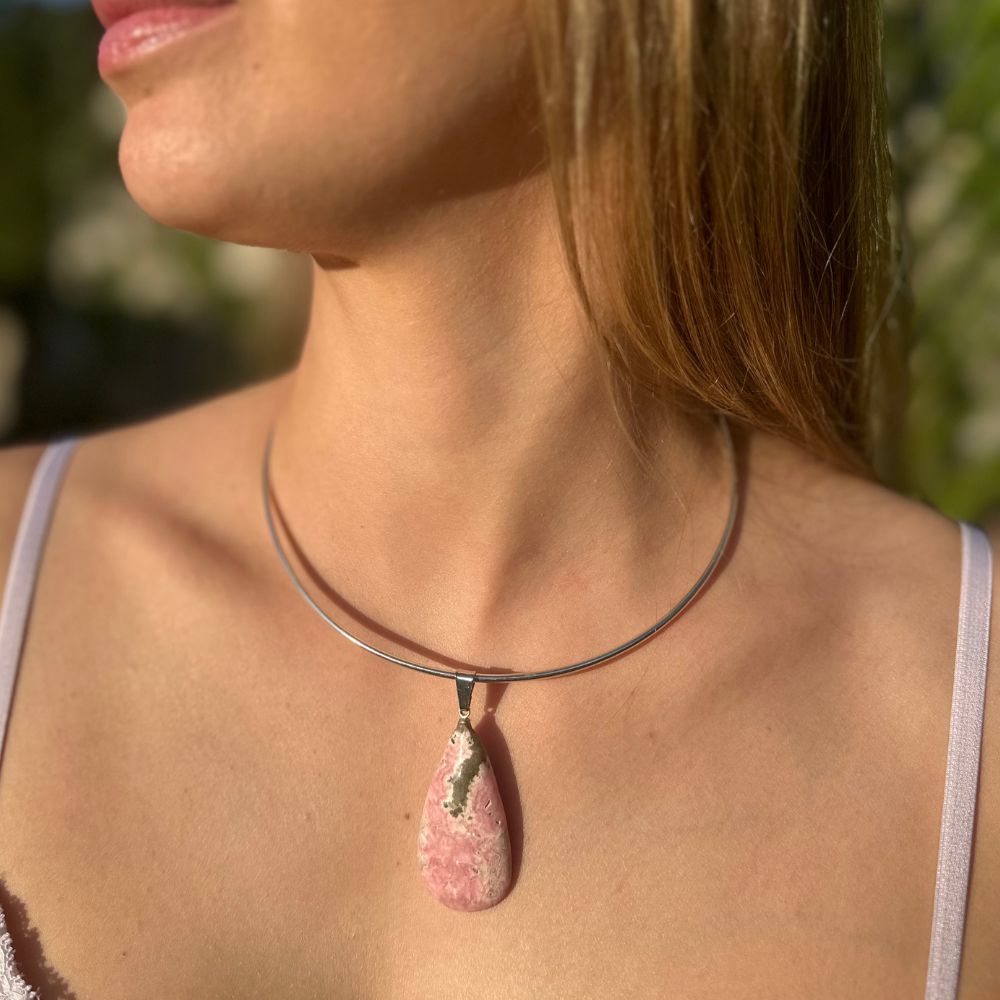 A gargantilha com pedra natural Rodocrosita da Jaya Pedras Naturais combina elegância e energia amorosa. O pingente de Rodocrosita destaca a beleza natural da pedra, tornando cada peça única. Este acessório não só complementa seu visual, mas também proporciona benefícios energéticos, promovendo amor e equilíbrio emocional.