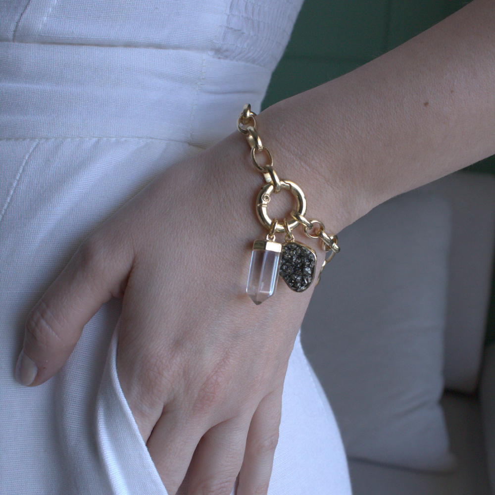 A Pulseira Aura Vivaz Pirita e Quartzo Transparente combina presença e leveza em um design contemporâneo. A corrente de elos marcantes recebe dois pingentes que se complementam: a Pirita em sua forma bruta e luminosa, e o Quartzo Transparente lapidado em ponta, trazendo um toque de pureza e luz.