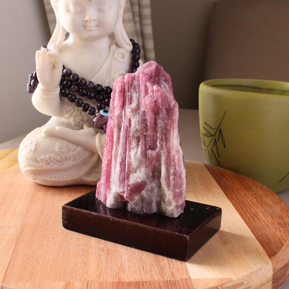 - Conteúdo: 1 pedra bruta Turmalina Rosa com Base de Madeira